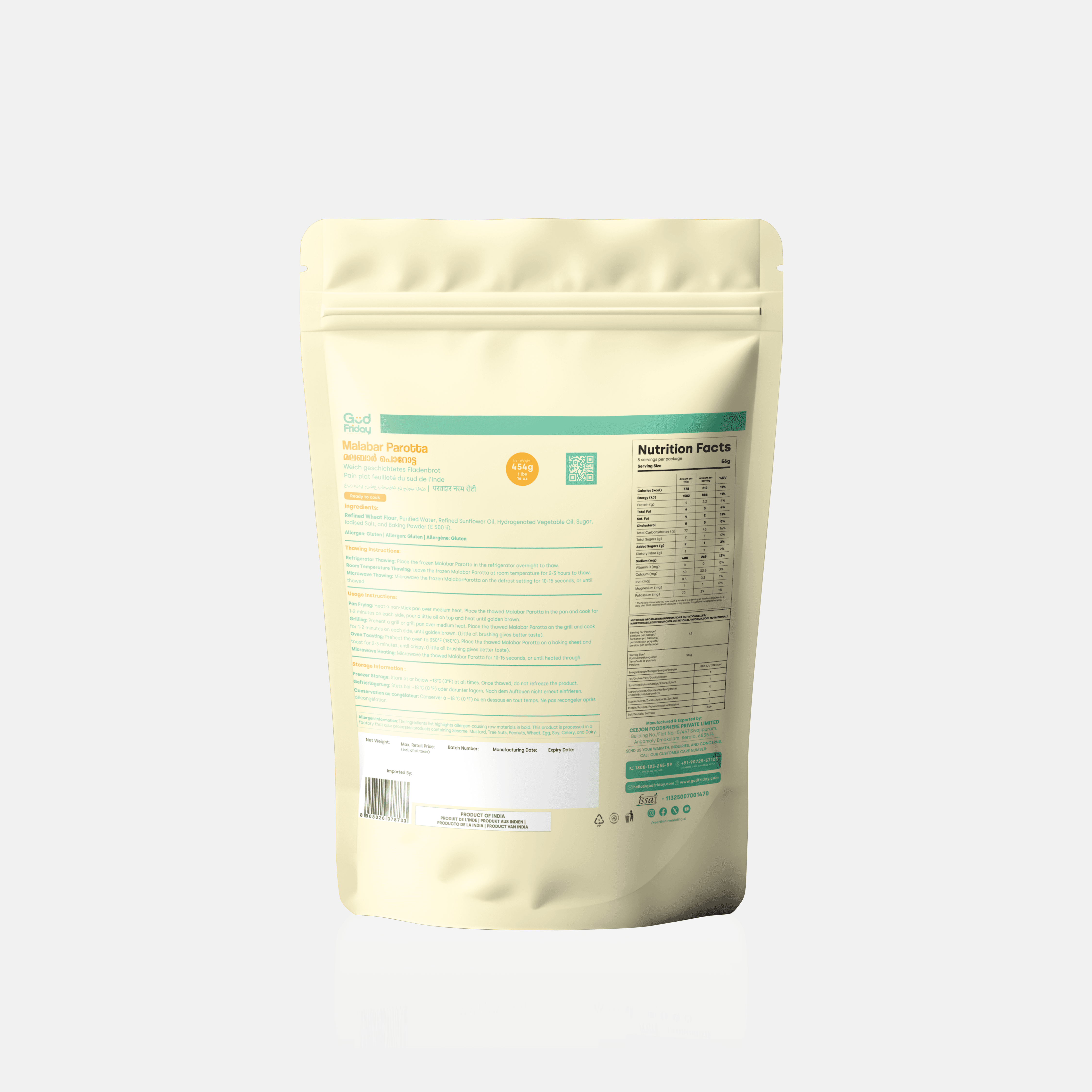Heat a non-stick pan over medium heat. Place the thawed Malabar Parotta in the pan and cook for 1-2 minutes on each side, pour a little oil on top and heat until golden brown.